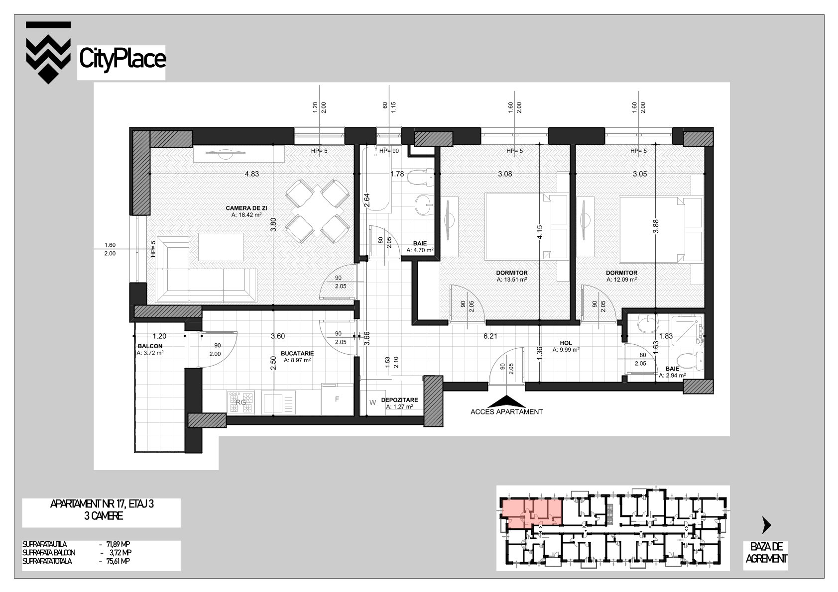 S. utilă: 71.89mp + 3.72mp balcon = 75.61mp